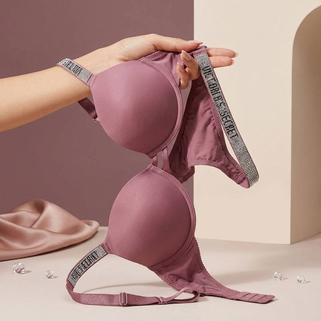 Bring home the luxury feel of Victoria Secret style lingerie with this premium crystal strap bra & thong set from Libaaya.pk.